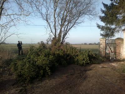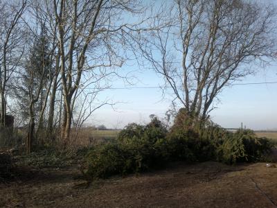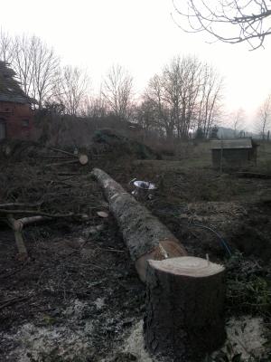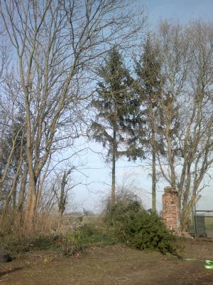 Vier Fichten, eine Blautanne, ein toter Kirschbaum, ein dicker Eschenast und ein Teil Holunder sind den Baumfällern gewichen. Alles ist entastet, das erste Brennholz ist gespalten und die guten langen Stämme sind ordentlich beräumt worden.