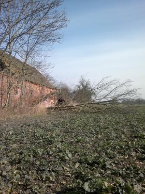 Ansonsten ist hier weiter viel passiert. In Zahlen: Neben Dutzenden Eschen sind sechs gefallen, diesmal hinter der Scheune, weil sie zu dicht am Gemäuer und am Dach standen. Und zum Bäume fällen gehört ja nicht nur das Umschubsen, sondern auch das Zerteilen und Bewegen.
