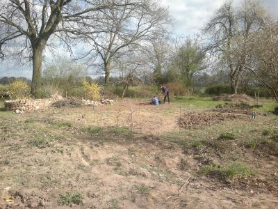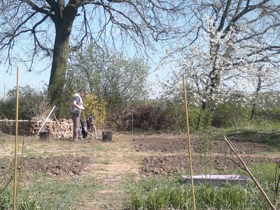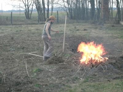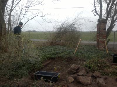 Wieland hat die gesamte Hoffläche von alten Pflanzenresten und dem trockenen Gras vom Vorjahr befreit und dabei zwei Tage lang Feuer und Qualm gemacht. Zusätzlich hat er begonnen im Garten ein Hochbeet anzulegen. Er nimmt dazu die alten Ziegelsteine, die überall auf dem Gelände zu finden sind.