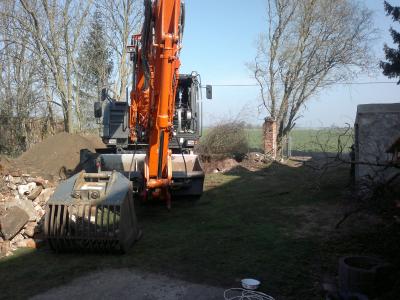 wir bestellten den Bagger, der noch am Freitag kam, er holte die großen Lindenstammstücke auf den Hof und baggerte und baggerte ein Riesenloch für die vollbiologische Kleinkläranlage und ein Kleineres für die Sickergrube.