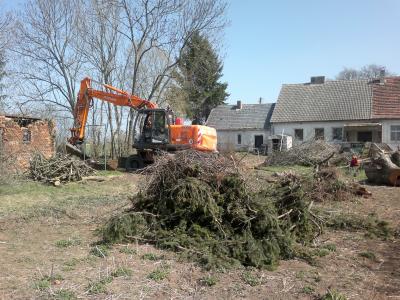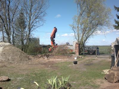 Und dann kam Tilman wieder, nachdem er eine Woche ausgesetzt hatte. Gerade war der Hof etwas beräumt und dann ging es wieder los… Der Platz für die Baugrube wurde weiter freigelegt bzw. das alte Fundament und dann stellte sich heraus, dass noch weitere Bäume wegmüssen. Jetzt liegt der Hof schon wieder voll Holz, was noch gesägt und gespalten werden muss! Aber unsere Brennholzvorräte wachsen!