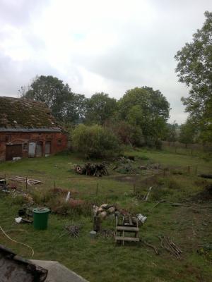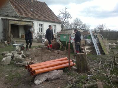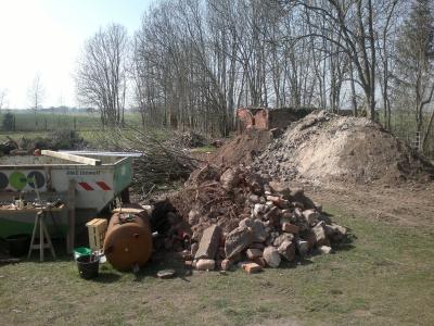 Jedes Mal, wenn es auf dem Hof zwischenzeitlich etwas aufgeräumter aussieht, wird etwas Neues begonnen und schon sieht der Hof wieder zugekruscht aus. So war es zum Beispiel am Dienstag, Tilman kam, er und Wieland haben geräumt und kaum hatten sie mit dem Fällen begonnen war wieder alles voll mit Ästen und Stämmen. Und Ziegel gibt es hier auf dem Hof - unendlich viele Ziegel, überall an den Außenseiten, wo einmal Gebäude standen und jetzt teilweise noch Ruinen sind, findet man Ziegel. Wenn die Oberfläche abgeräumt ist, buddelt man vorsichtig und schon findet man neue Ziegel, eine Geschichte ohne Ende. Aber Wieland hat wie immer gute Ideen, mit einigen Ziegeln bauen wir die ersten Hochbeete. Ist nur die Frage wann? Das Material ist da. Die Organisation ist hier alles!