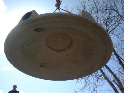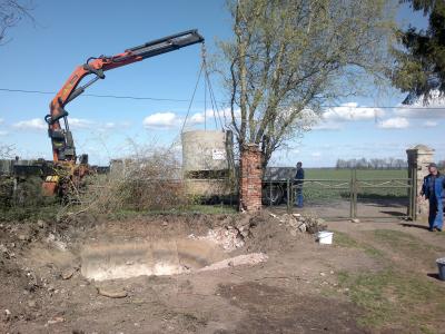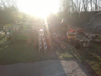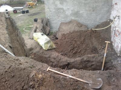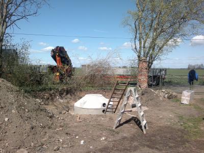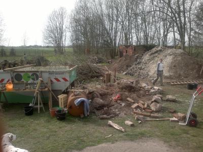 Am Montag den 13. April wurde dann die Kläranlage bestellt. Wieland verdichtete dann zügig den Boden der Grube mit Beton- und Ziegelrecycling, eine schweißtreibende Arbeit, für die er meine volle Hochachtung erfahren hat.