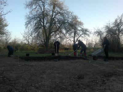Am Sonntag kam dann Ronja mit ihrem Freund, nach einem Frühstück ging es los. Zum Warmwerden setzten wir einige Johannis- und Stachelbeersträucher um, und dann ging es an den vom Bagger ausgesiebten Schutthaufen, ein Gemisch aus Erde, Steinen und Müll, der nach dem Krieg einfach nur verbuddelt wurde. Es wurde hart gearbeitet und trotzdem blieb etwas übrig. Aber Dank Ronja und Dennis kamen wir ein großes Stück voran. Vielen Dank Euch beiden, es war ein schöner, wenn auch sehr arbeitsintensiver Tag mit Euch.