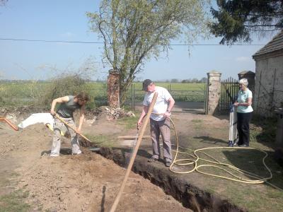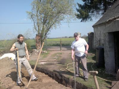 Dann die Absprache mit unserem Lieblingsklempner, wo und wie genau die Gräben zur Anlage und zur Grube entlang laufen sollen und dann nach einer gemeinsamen Stärkung: warmer Schokoladenkuchen mit Vanilleeis ging es ans Schaufeln und Buddeln. Unermüdlich arbeitete sich Kai unterstütz von Wieland, wie die „Raupe Nimmersatt“ durch den Boden… Abends gegen acht Uhr war der erste Graben in der Tiefe fertig! Es folgten ein gemeinsames Essen und angenehme Gespräche bis kurz nach Mitternacht.