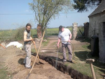 Um so früher ging es am nächsten Morgen weiter… ein gutes Frühstück mit Bioeiern von den „Nachbarinos“ und Kai buddelte, schaufelte, hackte und hebelte sich beim zweiten Graben durch eine kompakte Masse aus Feldsteinen und Ziegeln (altem Fundament) und Wurzelwerk. Wieland ebnete derweil die Sohle des ersten Grabens von 17m Länge. Nach einer kurzen Mittagspause kämpfte sich Kai weiter im Akkord durch den schier undurchdringlichen Boden. Unseren Respekt an dieser Stelle!