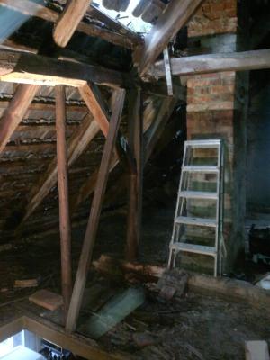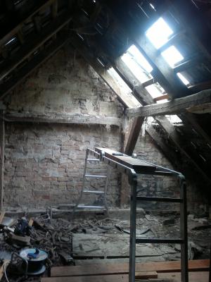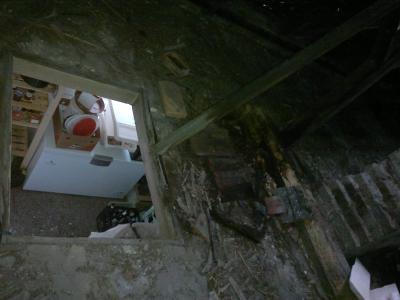 Zuerst öffneten sie den inneren Durchstieg zum Dach, auf dem früher das Brennholz für den Backofen (wir wissen das es einen gibt, der ist aber noch zugebaut /zugemauert) gelagert wurde und machten so den zweiten Zugang zum Dach möglich - es gibt noch einen Außeneinstieg. Die beiden Männer arbeiteten schwer und ausdauernd. Doch bei Tageslicht wurde auch deutlich, dass mehrere Dachlatten durchgefault waren und das Teile des Daches nur noch aus alter Gewohnheit zusammenhielten. Zuerst wurde zu meiner großen Sorge das Loch im Dach immer größer und größer, gefühlt haben die beiden das halbe Dach abgebaut.