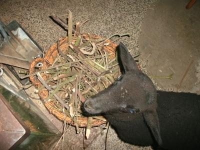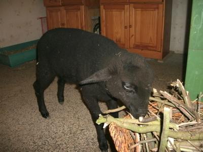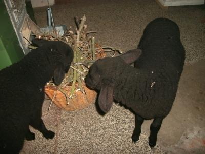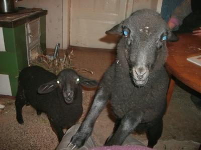 Und heute morgen halfen sie mir beim Auspacken des Einkaufs… fünf rohe Eier kullerten über den Boden, eine Mehlpackung wurde beinahe zerlegt und der Beutel mit den Zwiebeln wollte sich zum Kummer der beiden Lämmer nicht öffnen lassen, stellte aber gleichzeitig eine gute Fußfessel für Jera da, die lämmerlich klagte und auf der Stelle sprang, weil sie nicht fortkam. Gerade schlafen sie wieder lieblich an einander gekuschelt, als könnten sie nichts anstellen! Richtig süüüß die Beiden.